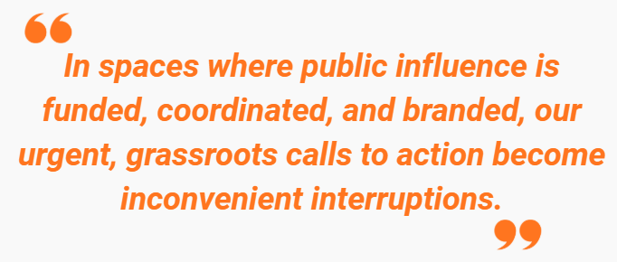 You see, in spaces where public influence is funded, coordinated, and branded, our urgent, grassroots calls to action become inconvenient interruptions.