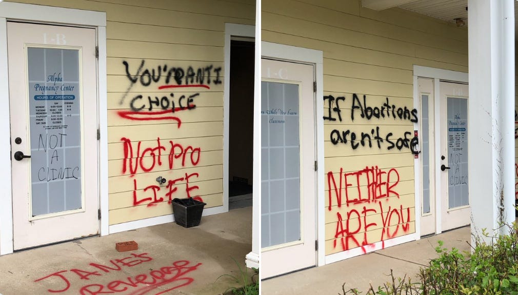 Post-Dobbs, fueled by anger at the decimation of more than 50 years of a woman’s constitutional right to her body, a new trend emerged: widespread vandalism at CPCs, purportedly by “radical pro-choice activists.” While these incidents (graffiti, broken windows, a few fires) are damaging to property; notably, they didn’t kill or injure anyone.