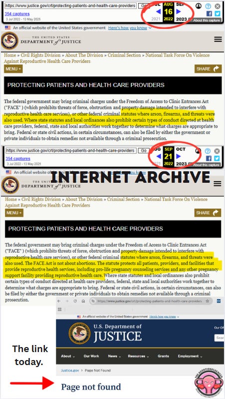 Regardless, in alignment with mounting GOP pressure, in a quiet but significant shift Biden’s DOJ amended its public description of the FACE Act to explicitly include Christian fake clinics under its protections, even dubbing them “pro-life” — a politically divisive term — rather than the more accurate “anti-abortion” or even “crisis” pregnancy centers. According to Internet Archive records, this language was added to the DOJ’s website between August 16 and September 21, 2022 — just months after the Dobbs decision.