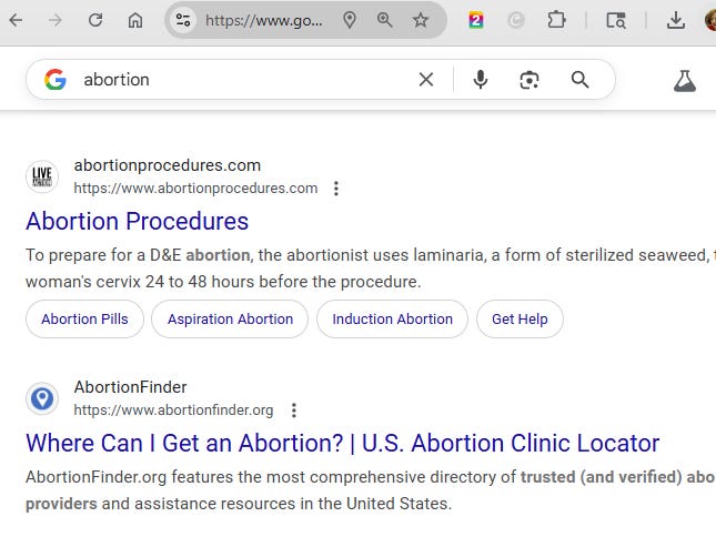 Anti-abortion organizations also use inflammatory, divisive language (such as calling abortion “baby murder"), which the Google algorithm favors. More engagement = higher ranking in search results.