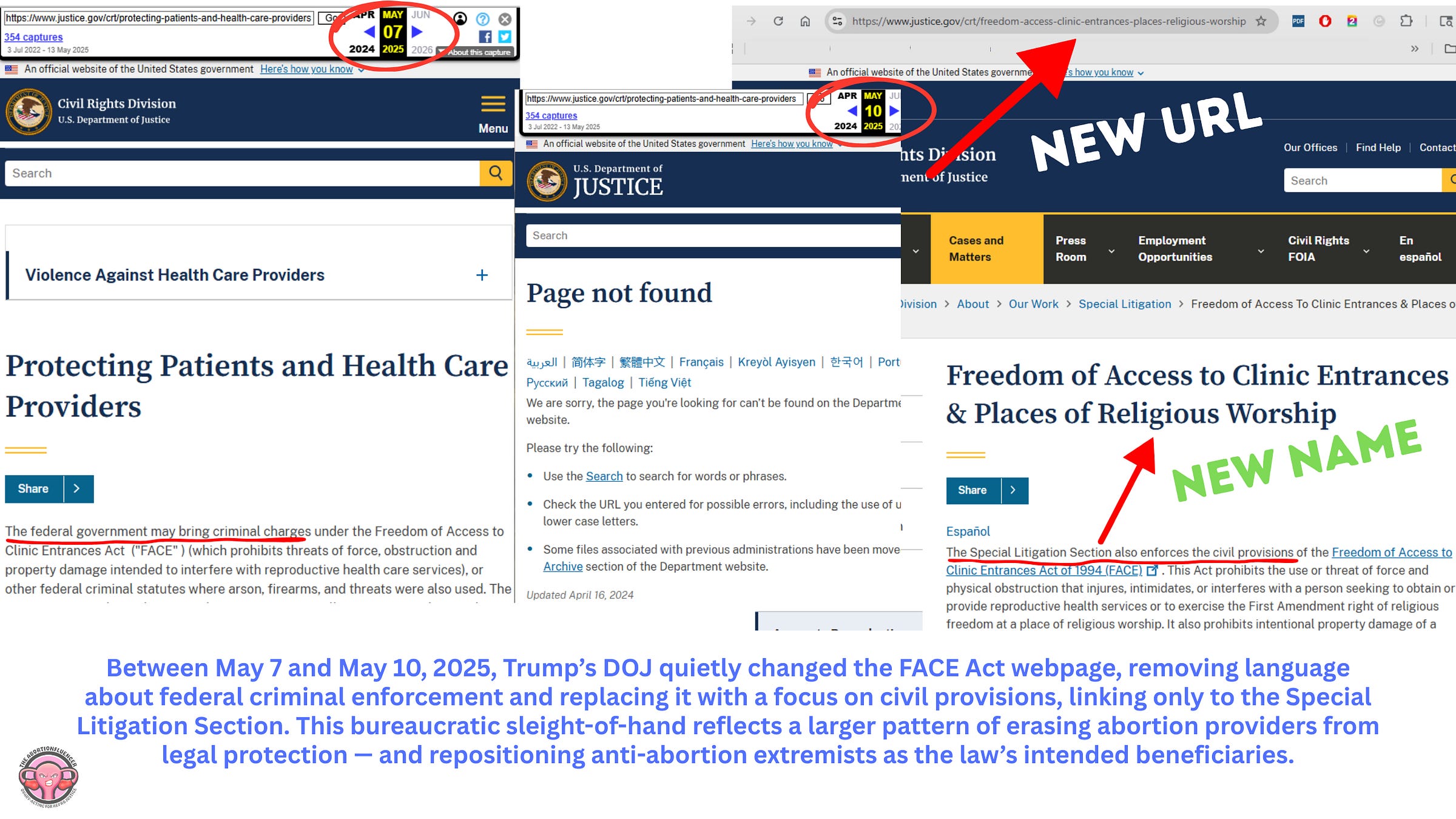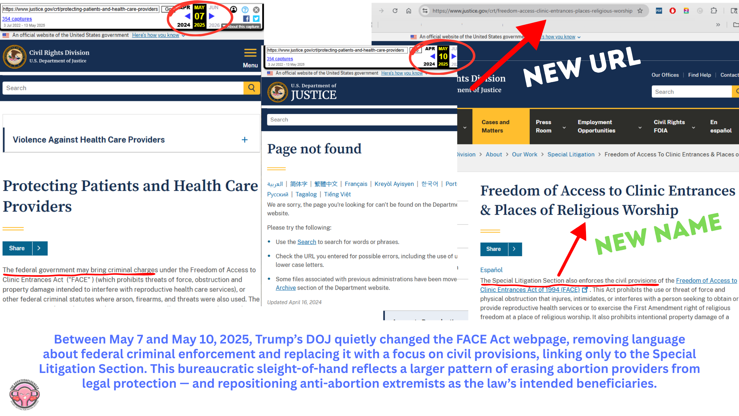 Jarringly, one of the first acts of the second Trump administration was to pardon 23 anti-abortion extremists who attacked and assaulted staff and patients at a DC abortion clinic (but not the repro rights activists who spray painted empty fake clinics). Trump’s DOJ subsequently declared that “future abortion-related FACE Act prosecutions and civil actions will be permitted only in extraordinary circumstances, or in cases presenting significant aggravating factors, such as death, serious bodily harm, or serious property damage,” opening the door for continued anti-abortion harassment, stalking, and terrorizing of abortion clinic providers, staff, and patients.
