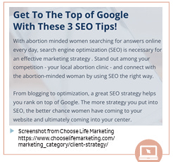 Online, anti-abortion organizations and CPCs spend millions for marketing to appear at the top of search results for terms like “abortion” or “abortion clinic,” despite not offering medical abortion services. These organizations use targeted search engine optimization, or SEO, strategies and pay for Google ads to reach people seeking reproductive care.