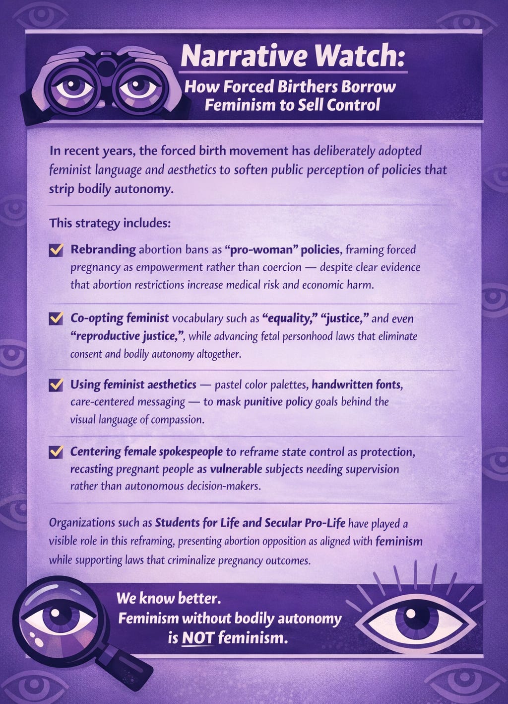 This didn’t happen overnight. The forced birth movement has spent decades capturing the narrative — framing the debate, controlling the language, lulling the media into a false equivalency, and shifting moral responsibility onto the very women, girls, and other pregnant folks harmed by its policies.